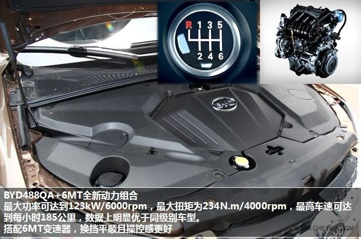 S6 2.4L手动尊贵型搭载的是BYD488QA+6MT全新动力组合。发动机动力非常充沛,即使在长长的缓坡上行驶依然可以感觉到持续不断的强劲动力输出,最大功率可达到123kW/6000rpm,最大扭矩为234N.m/4000rpm,最高车速可达到每小时185公里,数据上要明显优于同级别车型。且搭配6MT变速器,不仅增加了换挡的平顺性,提高了车辆的操控感,做到了较低油耗和充沛动力输出的平衡。