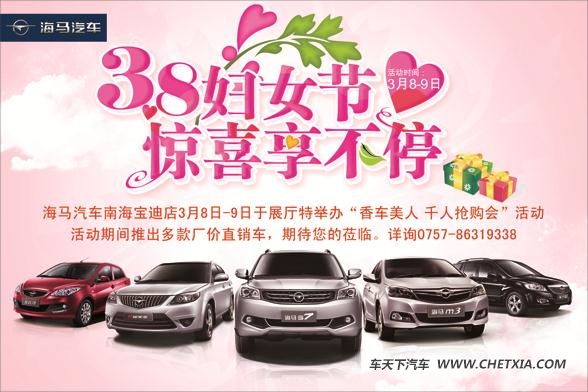 年后春来早,暖风万里飘。一望千里远,几多红花娇。三八佳节即将来临,海马南海宝迪为庆贺女人节的到来,在3月8日-9日于展厅特举办“香车美人 千人抢购会”活动,活动期间推出多款厂价直销车,期待您的莅临。详询0757-86319338。