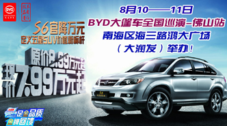 2013年8月BYD大篷车全国巡演 佛山站本周六日鸿大广场举行 车天下汽车网 发表于:2013-08-06 01:01 8月10、11日“BYD大篷车全国巡演-佛山站”活动在南海区海三路鸿大广场(大润发超市门前)举办,现场赏车有礼送,购车可获赠千元礼包,还能参与比亚迪足金金牌抽奖活动!S6官方 -